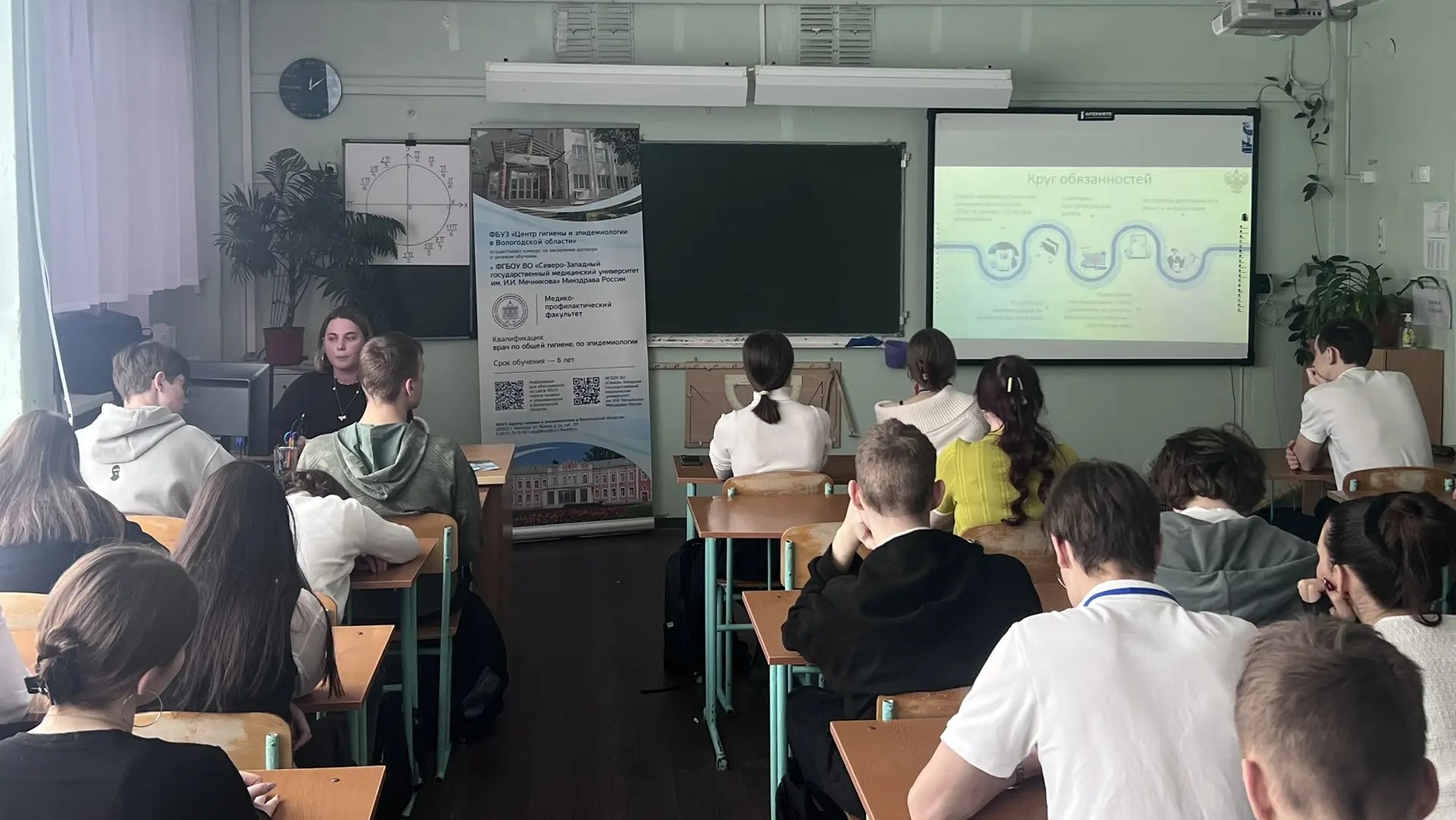 Специалисты ФБУЗ «Центр гигиены и эпидемиологии в Вологодской области» продолжают активную работу по профориентации среди учащихся школ города. Так, в МАОУ «Средняя общеобразовательная школа №14» был проведен увлекательный тематический урок, в ходе которого представители учреждения рассказали учащимся о важности профессии - врачей гигиенистов и эпидемиологов, привели примеры мероприятий, направленных на предупреждение инфекционных и неинфекционных заболеваний и вредного воздействия окружающей среды, условий жизни и труда на здоровье населения, показали презентации о деятельности и функциях врачей медико – профилактического профиля, об условиях заключения договора о целевом обучении в институте профилактической медицины ФГБОУ ВО «Северо – Западный государственный медицинский университет им. И.И.Мечникова» Минздрава России (г. Санкт – Петербург), выдали информационные памятки.
